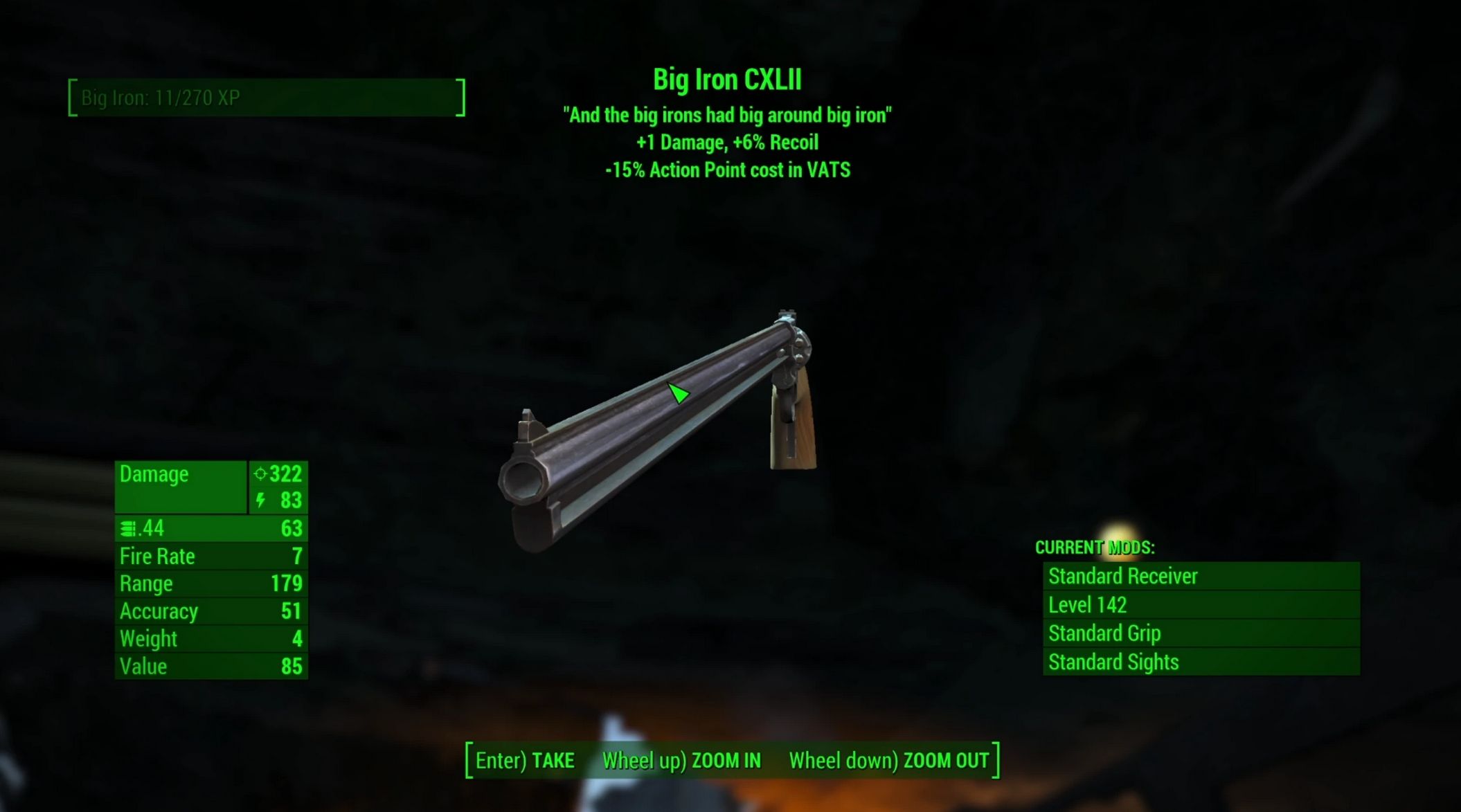 • This mod adds a unique Big Iron weapon near the start of Vault 111 which grows in length and power as you kill enemies.