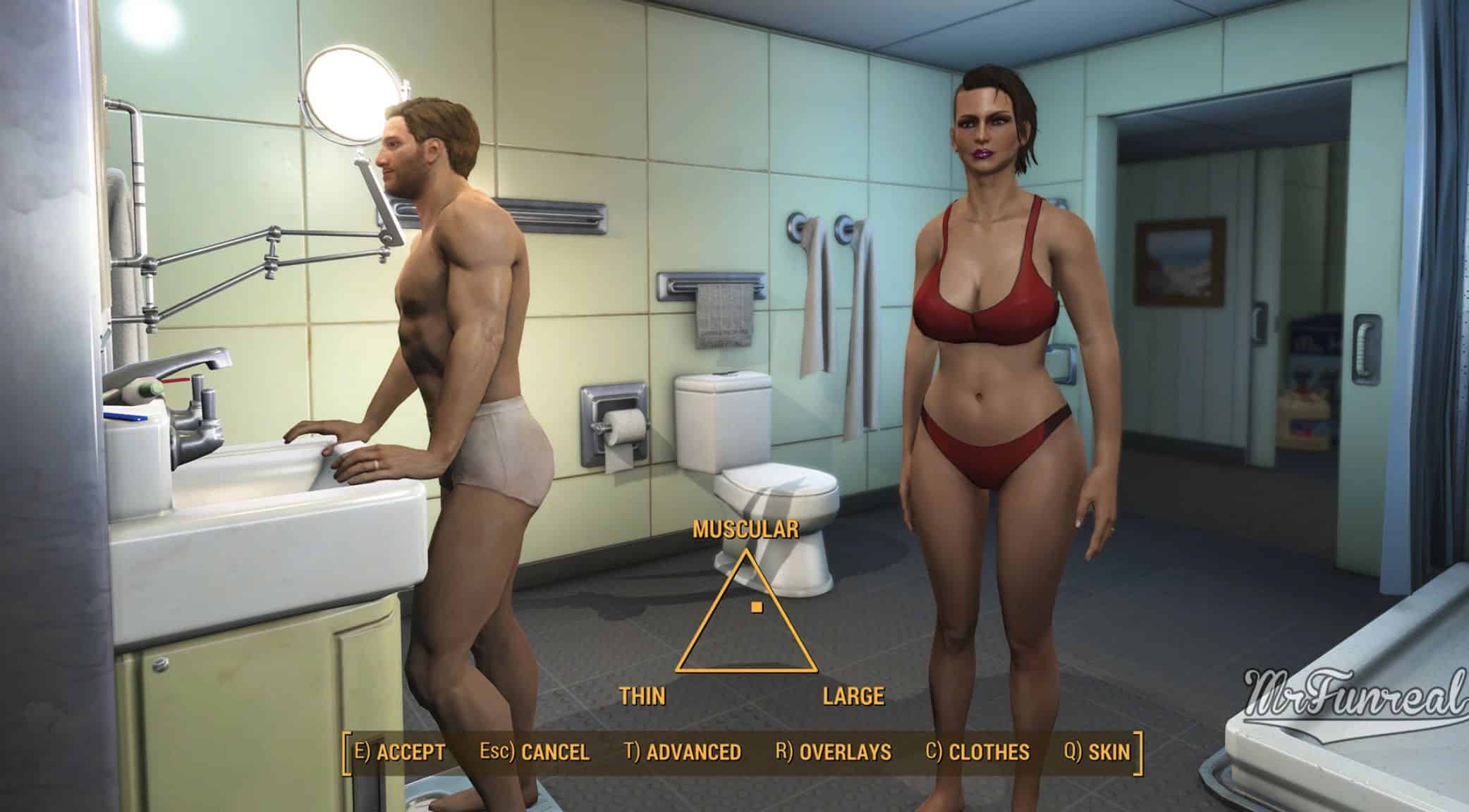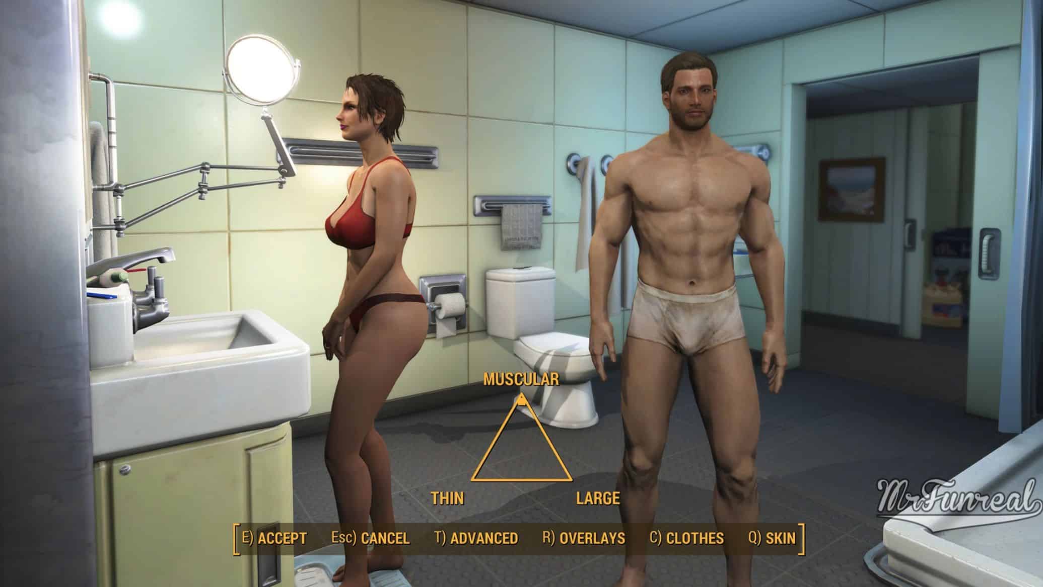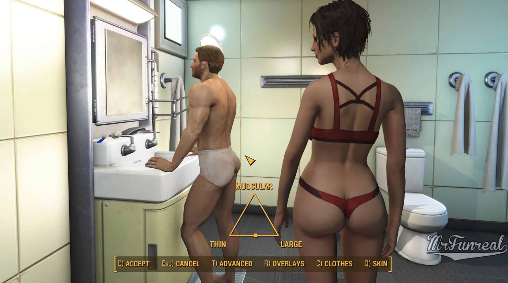 This mod simply does the same as undressing at any other time, showing your character in their underwear, or lack thereof.